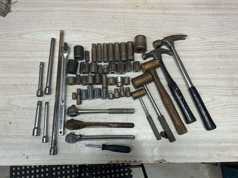 Lot has 1/2 inch drive sockets, ratchet, extensions and brakes bar and brass hammers.