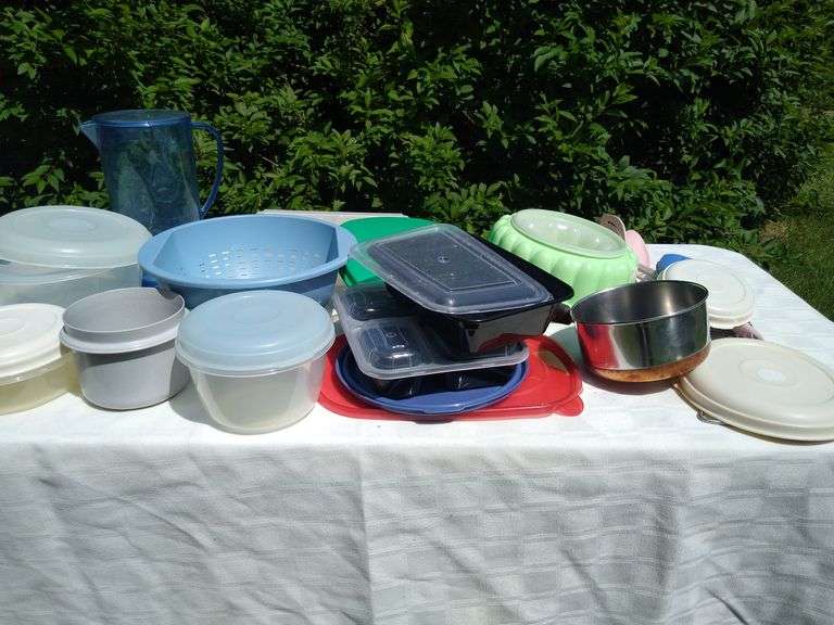 Kitchen lot storage containers, Revere Ware pan, colander more