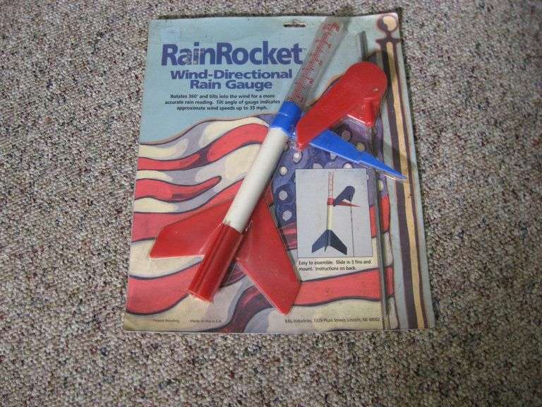 NEW OLD STOCK, RAIN ROCKET, WIND-DIRECTIONAL RAIN GAUGE. ROTATES 360 DEGREES AND TILTS INTO THE WIND FOR A MORE ACCURATE RAIN READING-MADE IN THE USA. IT IS ALL THERE-AS STATED, NEW IN THE PACKAGE. THIS IS ONE OF THE COOLEST RAIN GAUGES I HAVE EVER SEEN. :)