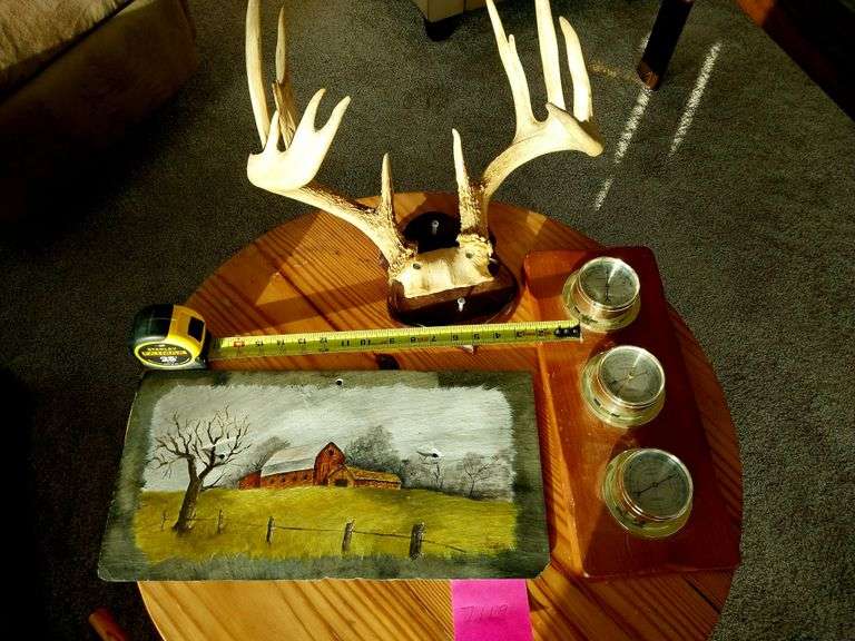 Very nice antlers and a painted slate tile. Also a weather station.