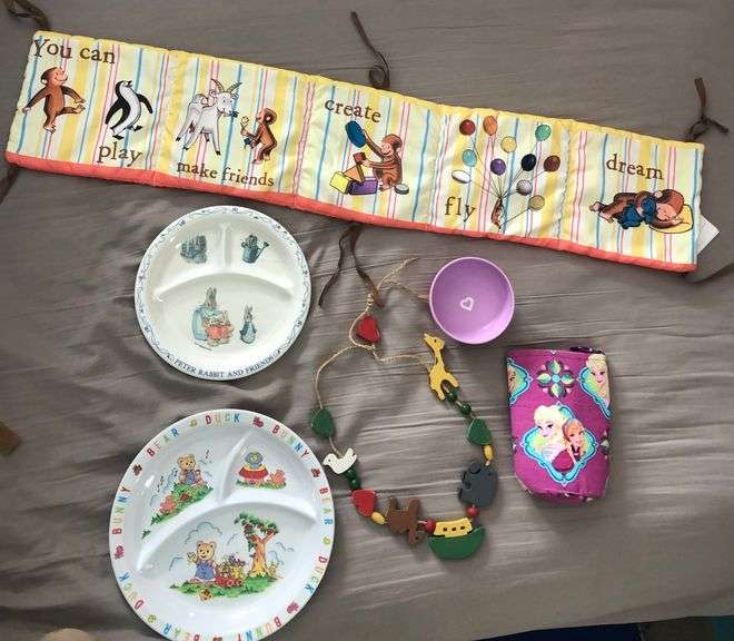 Lot of 6 charming kids items. Could be used as original purpose or repurposed for decoration. 2 divided plates (one is Peter rabbit), wood animal necklace, Elsa water bottle or carrier, small bowl and Curious George crib entertainer