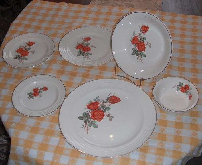 2 Sets Vintage MCM UPICO Ivory Red Rose 22K Gold Trim Place Settings consisting of 10-1/4" Dinner Plate, 8-1/4" Lunch Plate, 7-1/4" Salad Plate, 6-3/8 Dessert / Bread Plate, 8" Rimmed Soup Bowl, 5-1/4" Deep Bowl. 12 pcs. VG