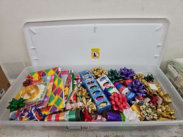 LOT 6543 - Sterilite 41QT tote with ribbons, bows, and gift bags 2a