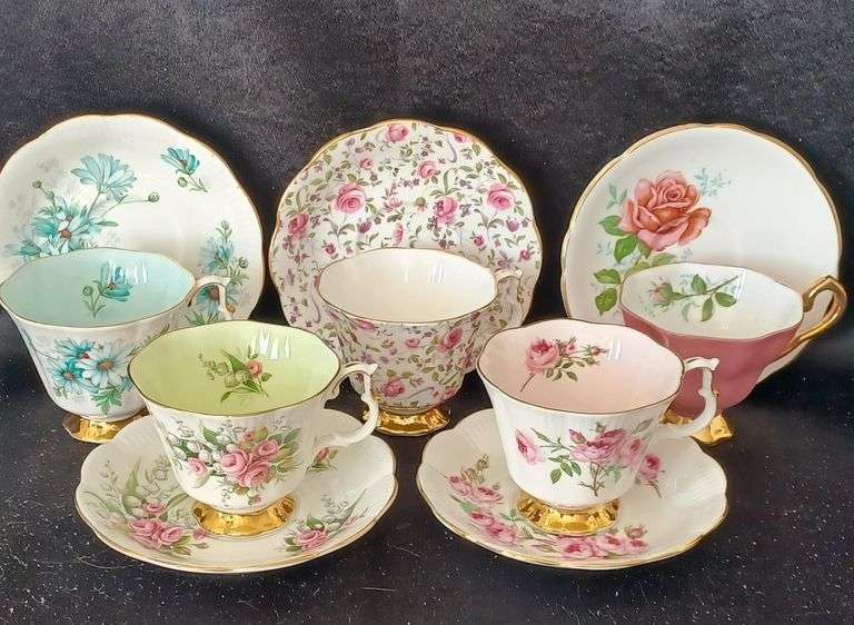 LOT 3465 - 5 Cups and Saucers Beautiful pink greenand turquoise