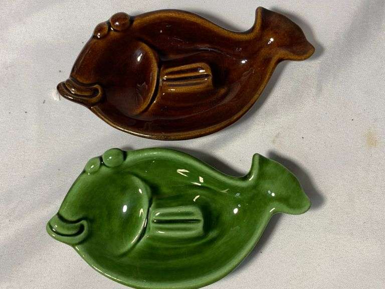 2-Vintage Ashtray Retro Maddux of California 7134 Fish Shape Green Foo Foo US
