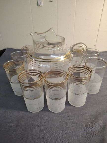 1950's Sugar frosted glass ball with gold rim pitcher and 10 glasses