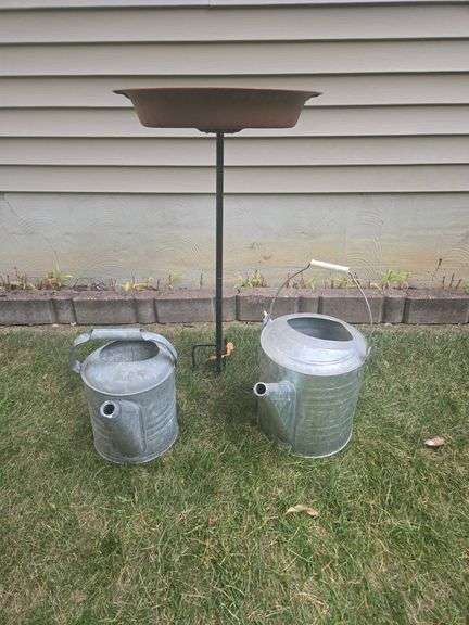 Bird Bath and 2 Galvanized Steel Watering Cans.