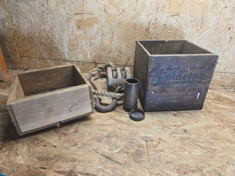 Wood Pulley, Metal Cylinder, Wood Box and Pilarine Grease Box by Standard Oil Company.