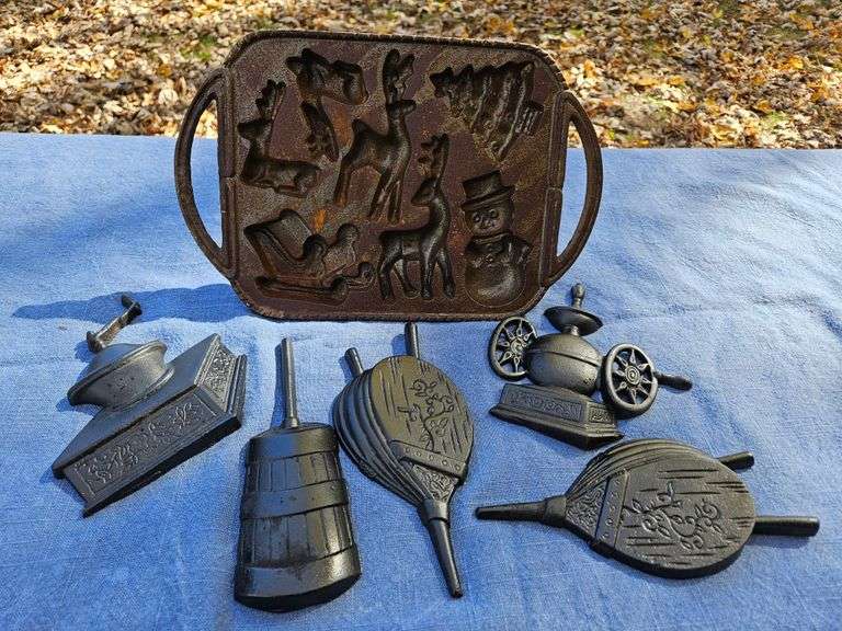 Cast iron Christmas mold pan and Cast iron wall plaques.