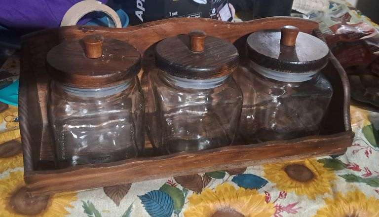 LOT 4675 - 3 canisters in a wooden shelf.