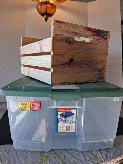 LOT 3520 - 14.7 gal clear tote with lid and wooden crate