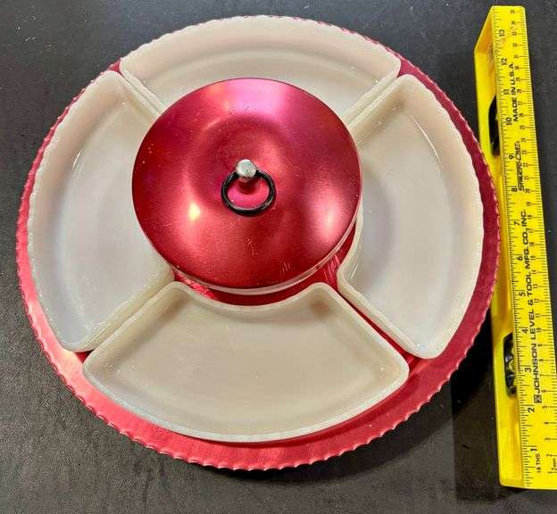 Ready for the holidays. Has 4 relish trays and a covered bowl in the middle. Red aluminum. great shape.