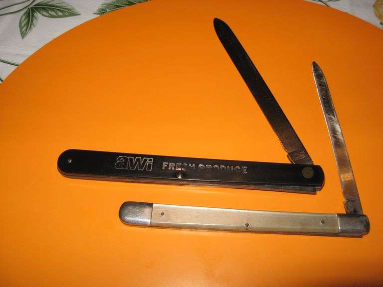 TWO FRUIT KNIVES WITH LONG THIN BLADES-ONE IS ATCO-JAPAN, THE OTHER IS A COLONIAL USA KNIFE WITH AWI-FRESH PRODUCE ADVERTISING.