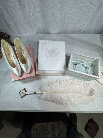 Wedding Lot: Fancy Feather Pen, Hallmark Wedding Book, Bride and Groom Glass Set and Size 9 White Satin Womans Shoes