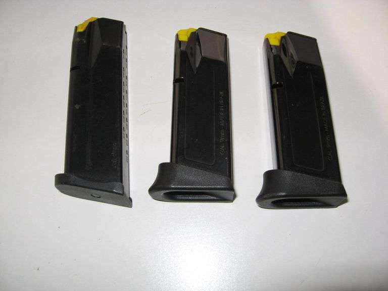 3 9MM MAGAZINES, ONE IS A MEC-GAR MAGAZINE, 15 ROUND MAG. THE OTHER TWO ARE CAL 9MM-MADE IN BRAZIL (12 ROUND) WHICH LEADS ME TO BELIEVE THAT THEY ARE FOR A TAURUS BRAND. ALL IN GOOD SHAPE.