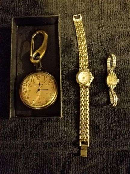 Pictured on the left is a brand new/never used bronze tone Thompson quartz pocket watch that clips to your belt loop...but needs a new battery. In the center is a ladies mixed gold & silver tone quartz water resistant Armitron wrist watch with a new battery and runs like a champ ! The last watch pictured on the right is a vintage silver tone ladies Elgin wind up with a stuck/broken stem. The pictures were taken with and without a flash to offer the best possible detail.