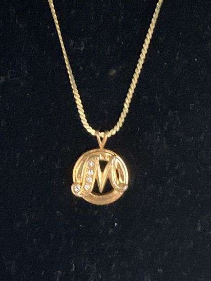 Gold tone necklace with letter M and rhinestones. Approx 18”