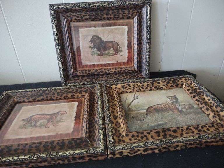LOT 624 - 3 Jungle cats with leopard print frames 13"×15"